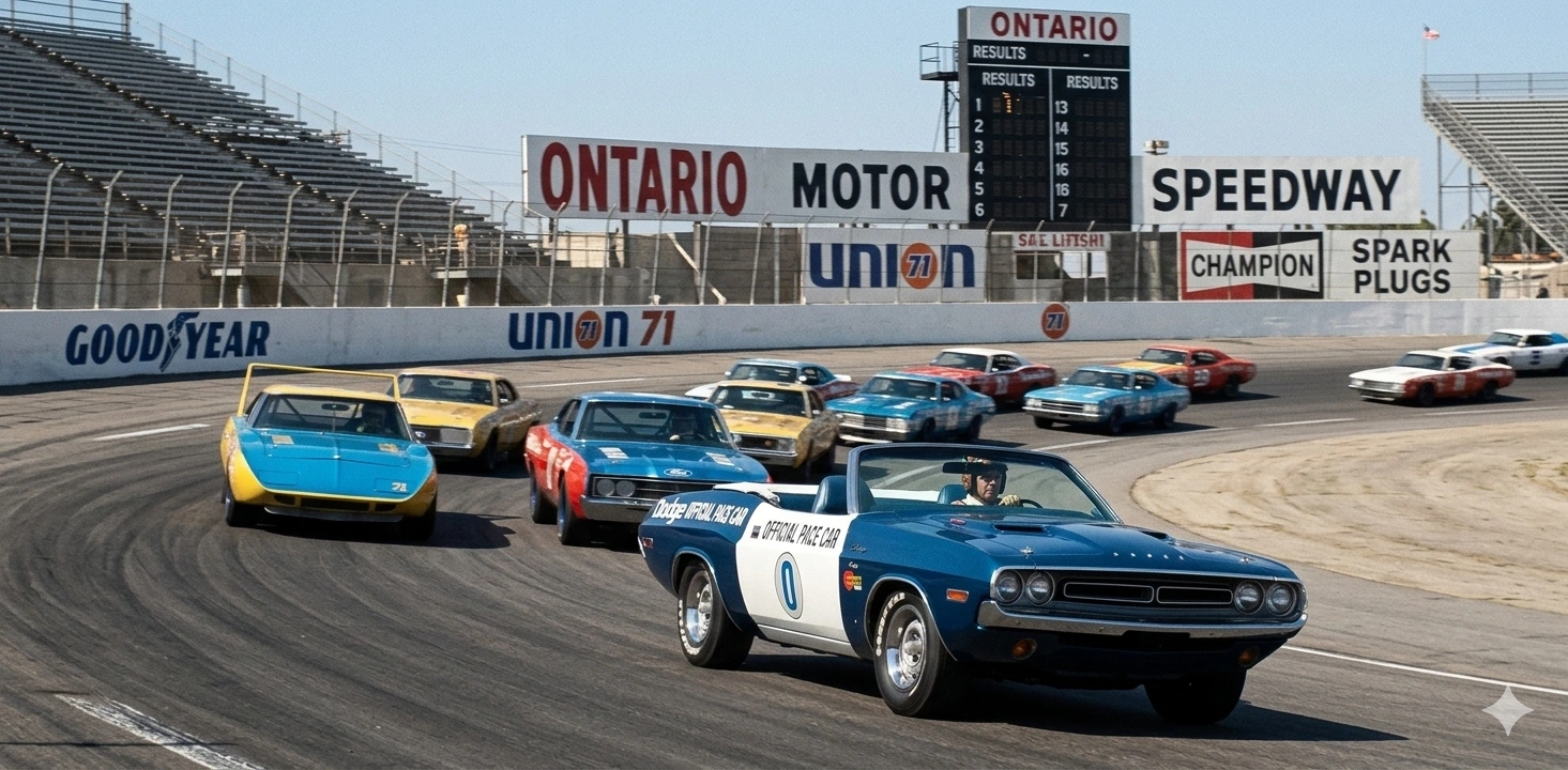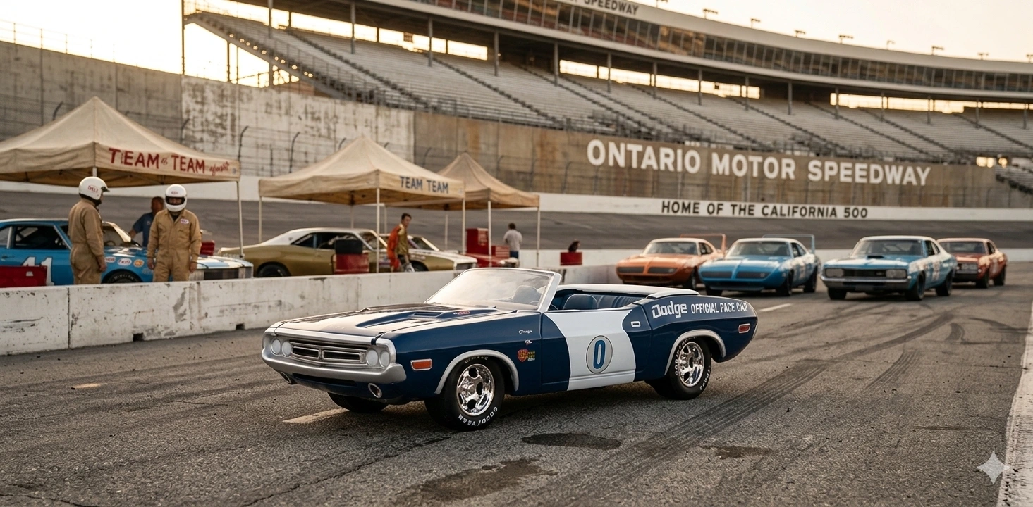 Tento model od spoločnosti Greenlight prináša kúsok americkej pretekárskej histórie priamo do vašej zbierky. Legendárny 1971 Dodge Challenger v prevedení kabriolet slúžil ako oficiálne zavádzacie vozidlo (Pace Car) na okruhu Ontario Motor Speedway v Kalifornii. Model v mierke 1:64 vyniká autentickým modro-bielym lakovaním s dobovou grafikou a logom okruhu, ktoré presne replikujú skutočnú predlohu z roku 1971.