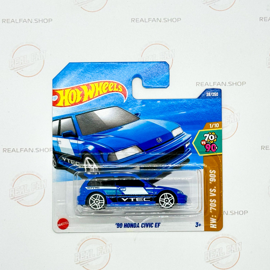 Hot Wheels 90 Honda Civic EF zo série HW: '70s vs. '90s z roku 2025 ; číslo zo série: 1/10 ; čislo z kolekcie: 28/250 ; kód: HYW81 ; farba: Modrá