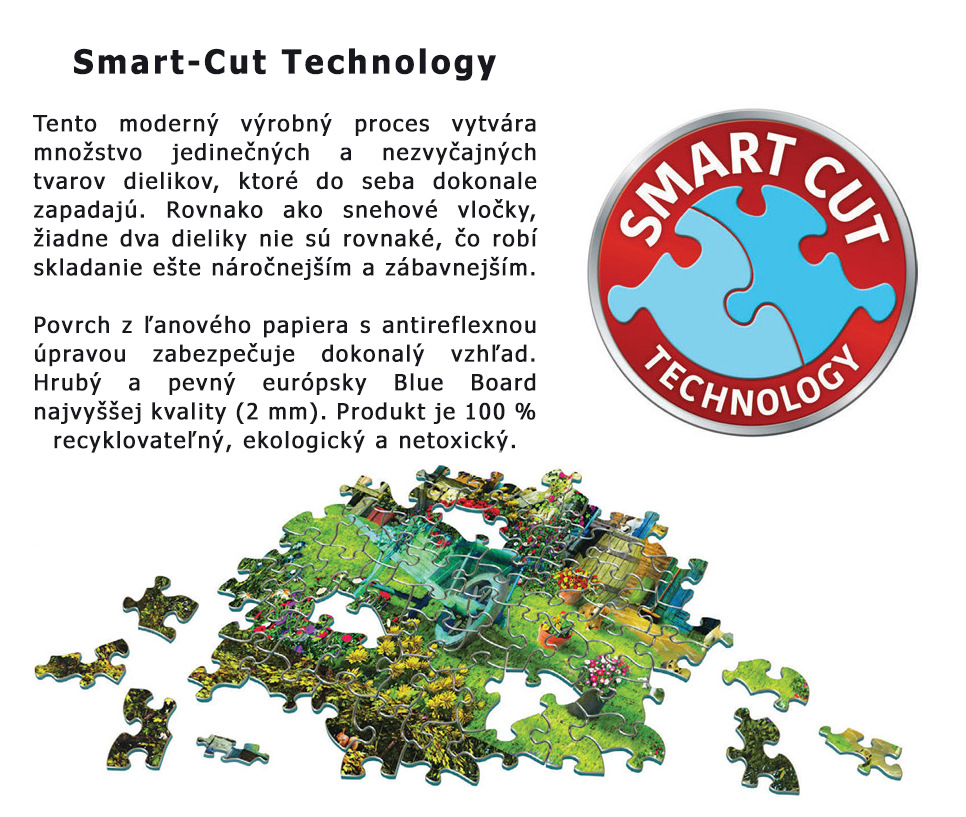 - Puzzle je vyrobené z prémiového recyklovaného európskeho blueboard papiera a potlačené farbami na rastlinnej báze.